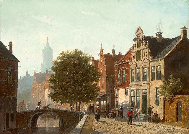 Frederik Roosdorp | Zonnig stadsgezicht met de Oude Kerk van Delft, olieverf op doek, 29,2 x 40,0 cm, gesigneerd verso met initialen