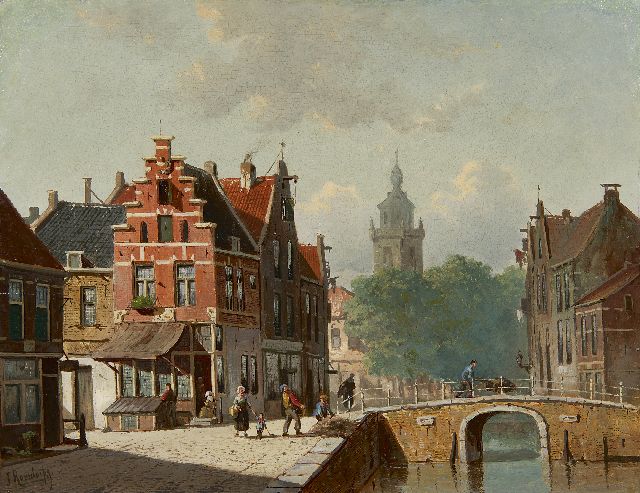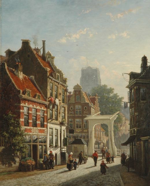 Frederik Roosdorp | Stadsgezicht met figuren bij een ophaalbrug, olieverf op paneel, 34,9 x 28,2 cm, gesigneerd l.o.
