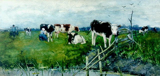 Geo Poggenbeek | Melkmeid en boer in weiland bij koeien, aquarel op papier, 21,6 x 44,3 cm, gesigneerd r.o.