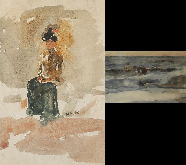 Een elegante vrouw, zittend; verso: Badende jongens in de branding