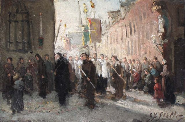 Gerard Johan Staller | Processie met vaandeldragers, olieverf op karton op paneel, 15,6 x 22,0 cm, gesigneerd r.o.
