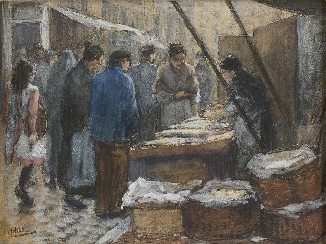 Gerard Johan Staller | Figuren bij een Amsterdamse visstal, aquarel en gouache op papier, 17,5 x 23,5 cm, gesigneerd l.o.