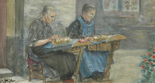 Gerard Johan Staller | Kantklossen, potlood, krijt en aquarel op papier, 12,1 x 22,1 cm, gesigneerd l.o.