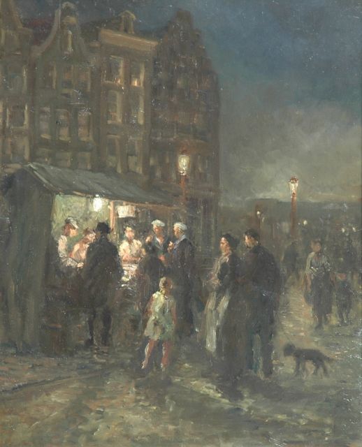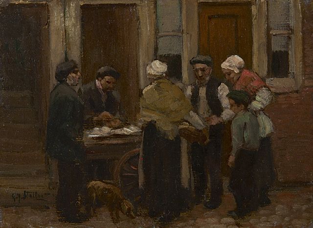 Gerard Johan Staller | Bij de haringkar, olieverf op doek op board, 12,2 x 15,7 cm, gesigneerd l.o.