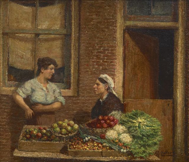 Gerard Johan Staller | Groenteverkoopsters, Amsterdam, olieverf op paneel, 18,8 x 21,9 cm, gesigneerd r.o.