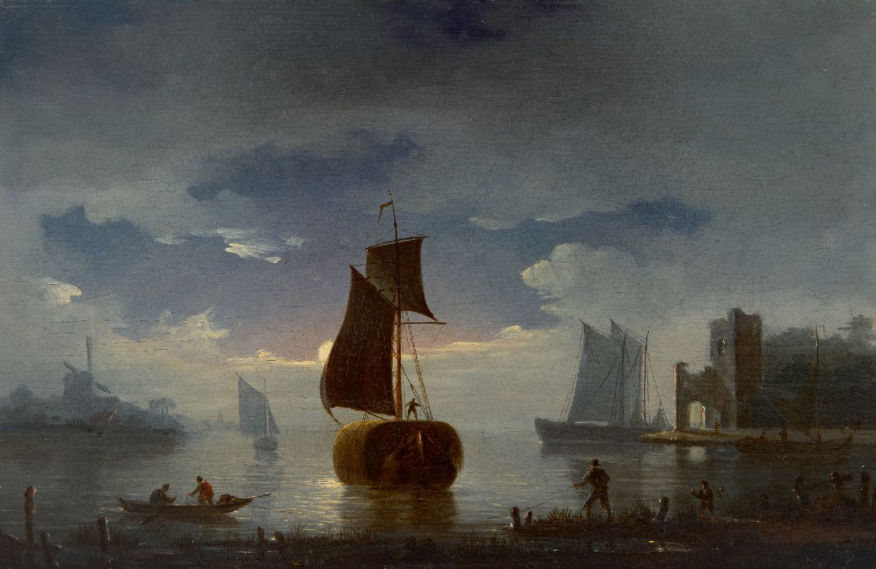 Gerrit Gruijter | Afmerend hooischip bij maanlicht, olieverf op paneel, 22,4 x 33,0 cm