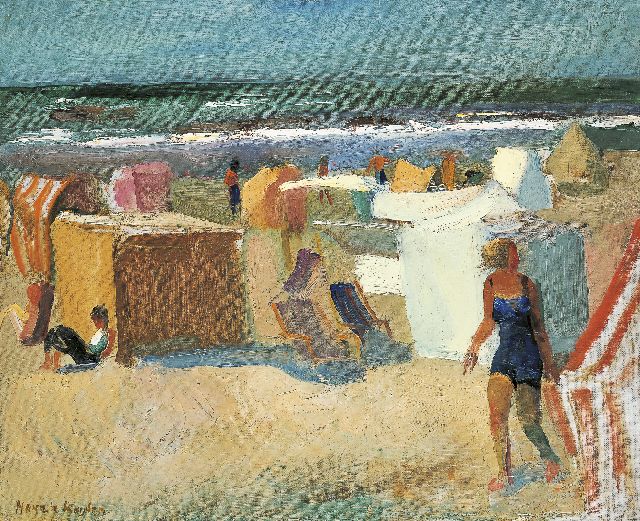 Kenmerkend voor het werk van Harrie Kuijten is zijn diversiteit aan stijlen, waarbij hij in geen enkele stroming wenste ingedeeld te worden. Hij was altijd al geboeid door de menselijke figuur en naast zijn voorkeur voor het naakt, dat hij zijn hele leven zou blijven schilderen, beeldde hij naast feesten en kleurige marktscènes ook strandgezichten af, waarin hij de zonnige kant van het leven toont. Naast het succes dat hij vanaf 1915 had met zijn naaktfiguren verwierf de schilder ook met zijn 'strandjes' grote bekendheid. Ze zijn doorgaans niet groot van formaat en zonder uitzondering in snelle, rake streken neergezet: momentopnames van het badleven aan de Hollandse kust. Prachtig is de manier waarop hij de luchten schildert en de beweging van de zee met zijn aanrollende golven, met in de branding de kleurige baders. Vanaf de jaren dertig vertoont het werk van Kuijten verwantschap met de Bergense School in de donkere, in forse vormen neergezette Bergense landschappen en stillevens.
