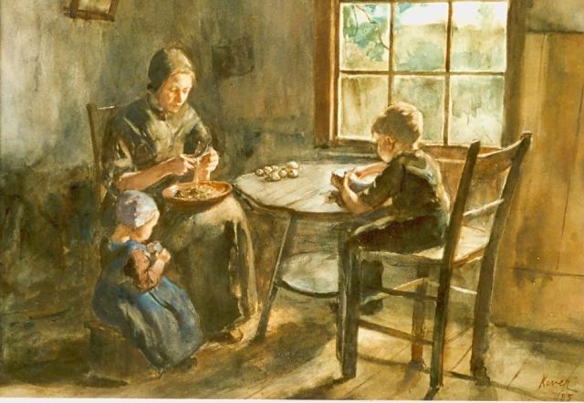 Hein Kever | Moeder helpen met aardappels schillen, aquarel op papier, 40,7 x 50,5 cm, gesigneerd r.o. en gedateerd '85