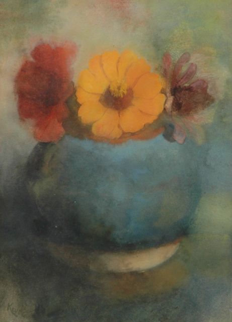 Hein Kever | Zinnia's in gemberpot, aquarel op papier, 26,6 x 19,4 cm, gesigneerd l.o.