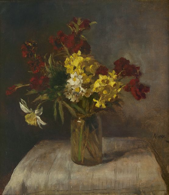 Hein Kever | Voorjaarsboeket in glazen pot, olieverf op doek, 53,5 x 47,2 cm, gesigneerd r.m.