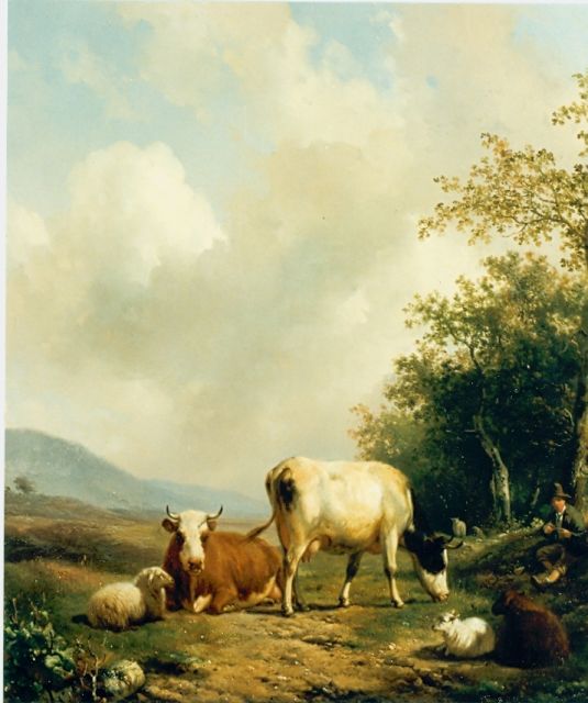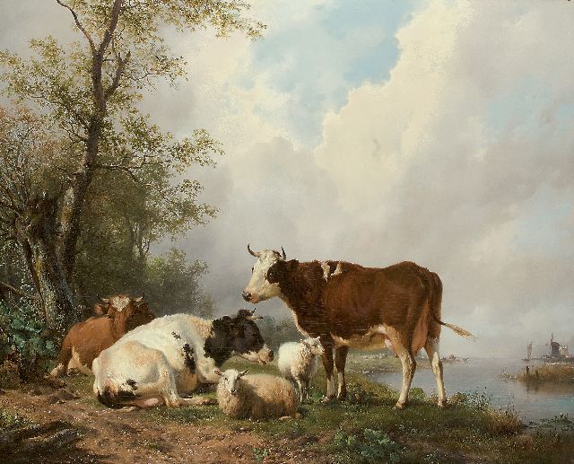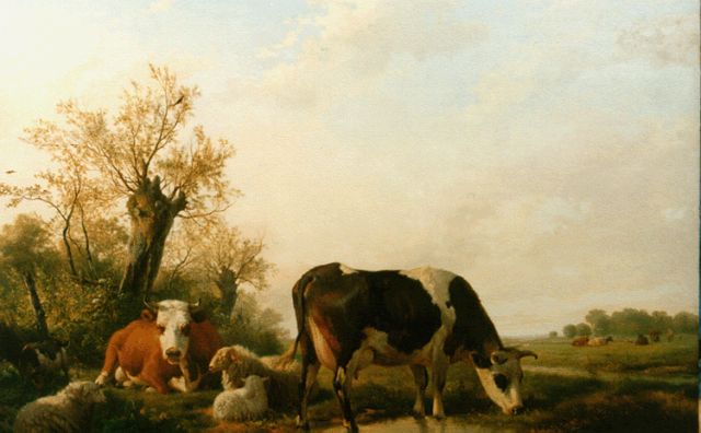 Hendrikus van de Sande Bakhuyzen | Landschap met rustende koeien en schapen, olieverf op doek, 108,3 x 150,1 cm, gesigneerd l.o.