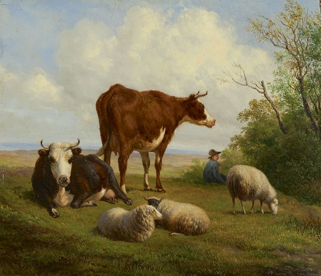 Hendrikus van de Sande Bakhuyzen | Herder met zijn kudde, olieverf op paneel, 52,0 x 46,0 cm, gesigneerd l.o.