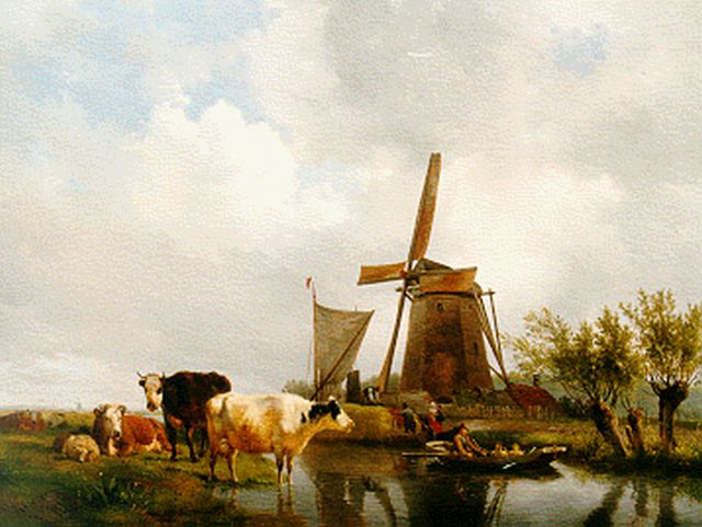 Hendrikus van de Sande Bakhuyzen | Zomers landschap met molen en vee, olieverf op paneel, 47,7 x 63,5 cm, gesigneerd l.o.