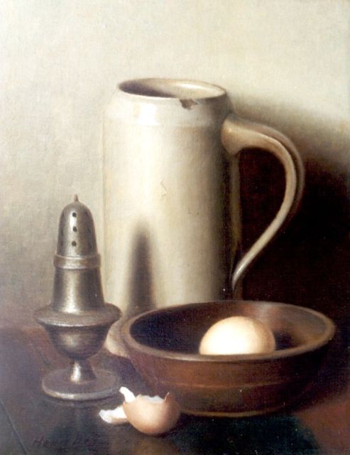 De Gooise kunstenaar Henk Bos leerde zichzelf schilderen. Hij verbeeldde in realistisch-impressionistische stijl landschappen, bloemstukken, (zelf)portretten en stillevens. Vooral dit laatste onderwerp boeide hem. Het zijn ingetogen tafereeltjes van eenvoudige, bijeen gezette voorwerpen zoals een kan met een schaal eieren, of een stapel boeken bij een vaasje veldbloemen. In de traditie van de 17e-eeuwse Hollandse schilders is hij een meester in het schilderen van koper, tin en oud aardewerk.