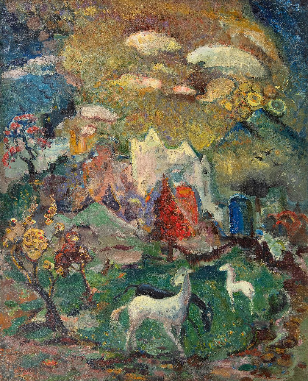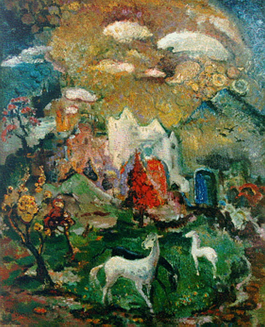 Henk Gorter | Paarden in een landschap, olieverf op doek, 79,5 x 64,2 cm, gesigneerd l.o.