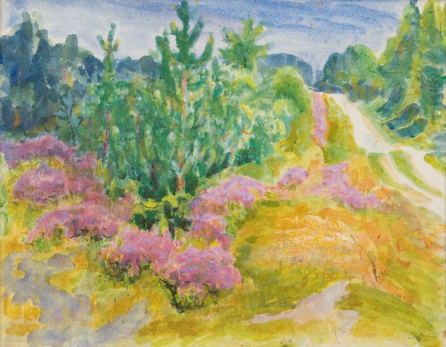 Landweg door dennenbos en bloeiende heide