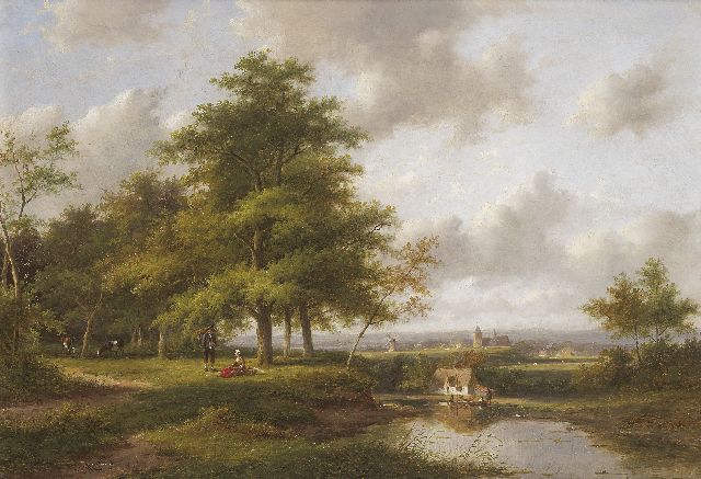 Jan Evert Morel II | Panoramisch landschap met rustend landvolk, olieverf op paneel, 35,3 x 50,9 cm, gesigneerd l.o.