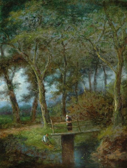 Jan Evert Morel II | Landvolk bij een brug in het bos, olieverf op paneel, 20,2 x 15,5 cm, gesigneerd r.o.