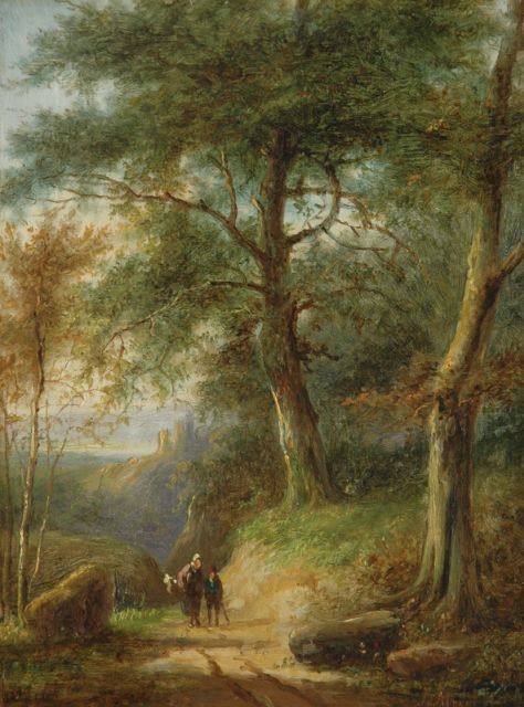 Jan Evert Morel II | Reiziger met pakezel op een bospad, olieverf op paneel, 18,1 x 13,7 cm, gesigneerd l.o.