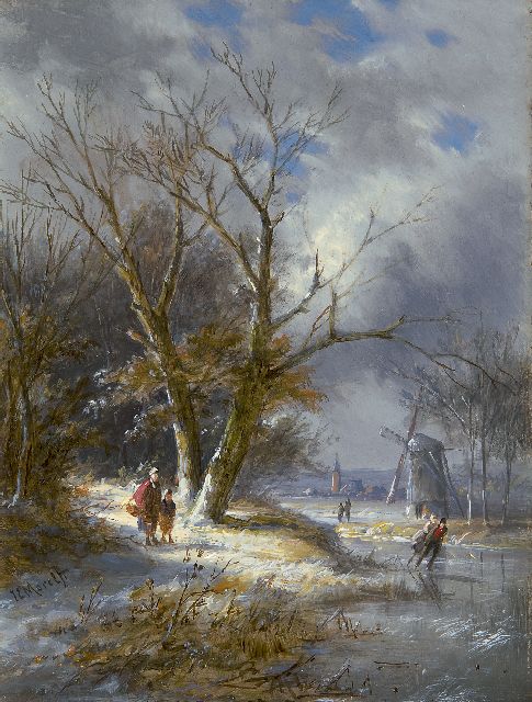 Jan Evert Morel II | Sneeuwlandschap met schaatsers en wandelaars, olieverf op paneel, 16,0 x 21,5 cm, gesigneerd l.o.