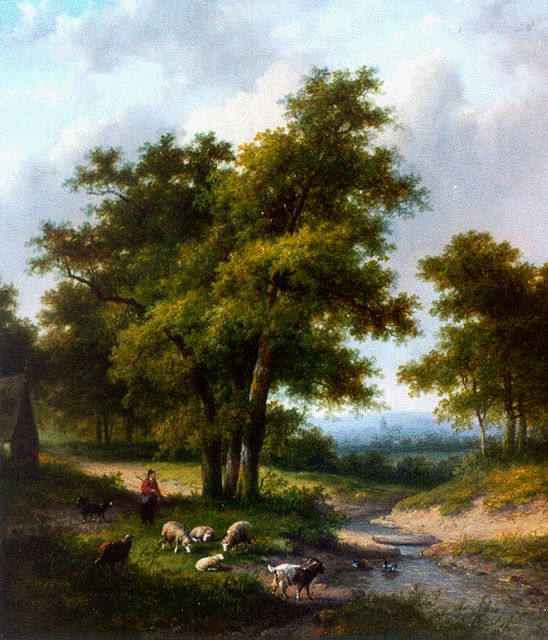 Jan Evert Morel II | Herder met zijn kudde in boomrijk landschap, olieverf op doek, 31,7 x 28,1 cm, gesigneerd m.o.