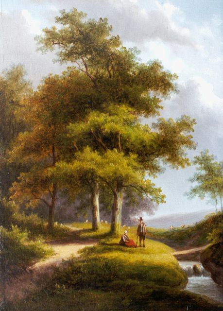 Jan Evert Morel II | Figuren bij beekje langs de bosrand, olieverf op paneel, 18,1 x 13,8 cm, gesigneerd ach zyd en gedateerd 1874