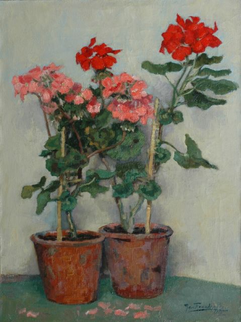 Jan Franken | Geraniums in bloempotten, olieverf op doek, 72,6 x 55,5 cm, gesigneerd r.o. en op etiket op spieraam en gedateerd 1915
