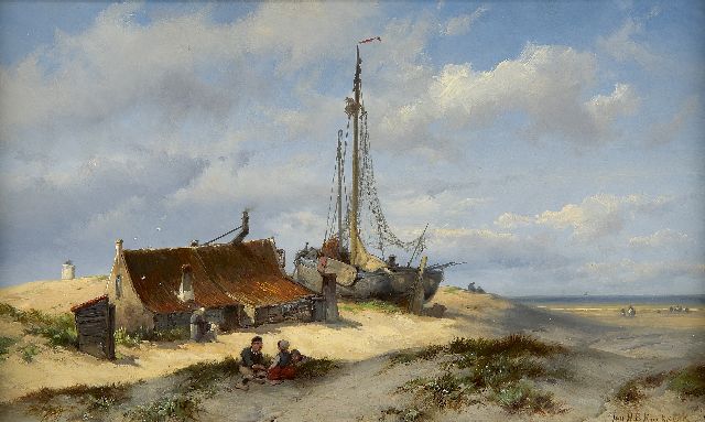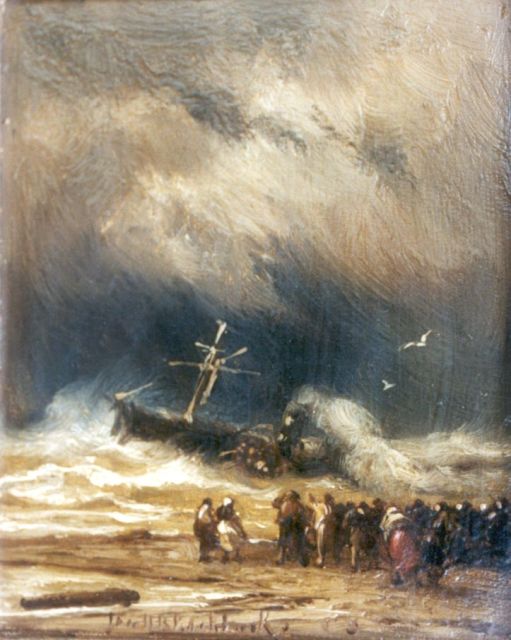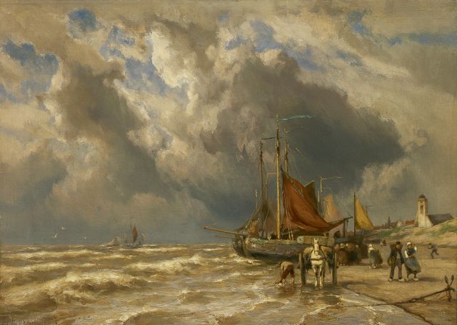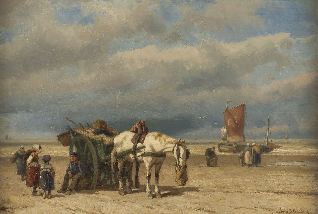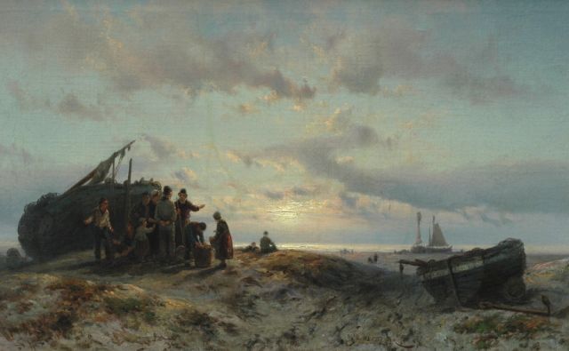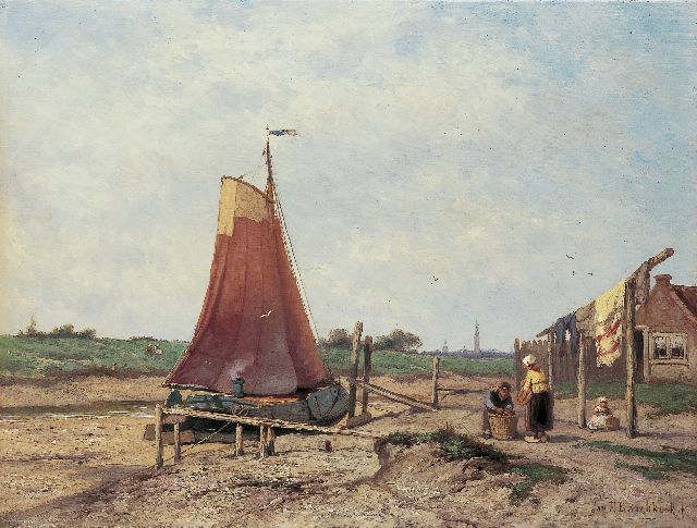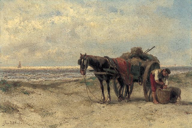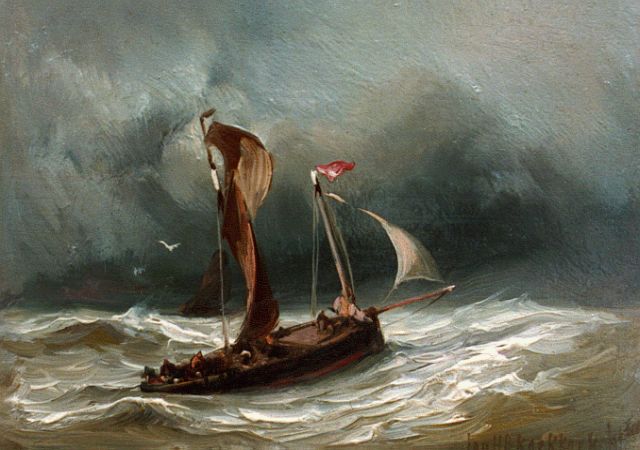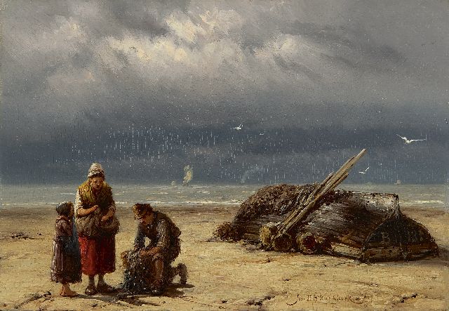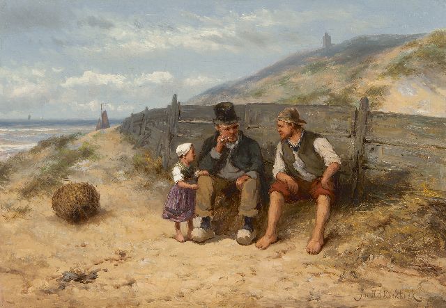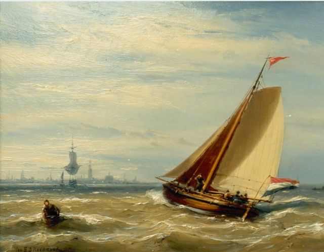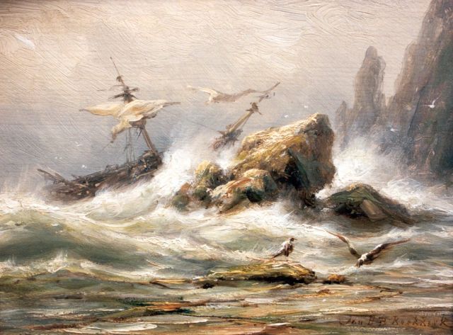Johannes Hermanus Barend, ofwel ‘Jan H.B. Koekkoek’, maakte als schilder een interessante ontwikkeling door. In 1859 debuteerde hij op de Tentoonstelling van Leevende Meesters in Amsterdam met een zeegezicht getiteld ‘Woelend water met schepen’. Daarin hanteerde hij de inmiddels voor de Koekkoek-familie kenmerkend geworden gedetailleerde uitwerking en fijne penseelstreek. In 1864, op 24-jarige leeftijd, verruilde de schilder zijn woonplaats Amsterdam voor Hilversum, waar niet lang daarvoor zijn ooms B.C. en M.A. hadden gewerkt. Mogelijk onder invloed van het impressionisme van de in het Gooi opkomende Larense School verandert daar geleidelijk aan zijn schilderstijl. De fijne, precieze uitwerking en nauwelijks te onderscheiden penseelstreek maken plaats voor een snelle, lossere schildertrant. Ook zijn onderwerpkeuze verandert en breidt zich in de jaren tachtig en negentig uit met visserstaferelen, strandgezichten met bommen, schelpenvissers en enkele polderlandschappen. Onderwerpen die favoriet waren bij de schilders van de Haagse School. Zijn schilderwerken voorziet Jan H.B. in deze Hilversumse periode aan de achterkant dikwijls van een verzegelde authenticiteitsverklaring met onderwerp en datum. Geliefd bij de schilder waren de vissersplaatsen rond de Zuiderzee, langs de Noordzeekust - Egmond, Zandvoort, Scheveningen en Katwijk -, de Maas bij Rotterdam en het Zeeuwse Veere. Naast zijn ‘moderne’ onderwerpen schilderde Jan H.B. ook romantische schipbreuken, waarin onderwerp en stijl als het ware versmelten.