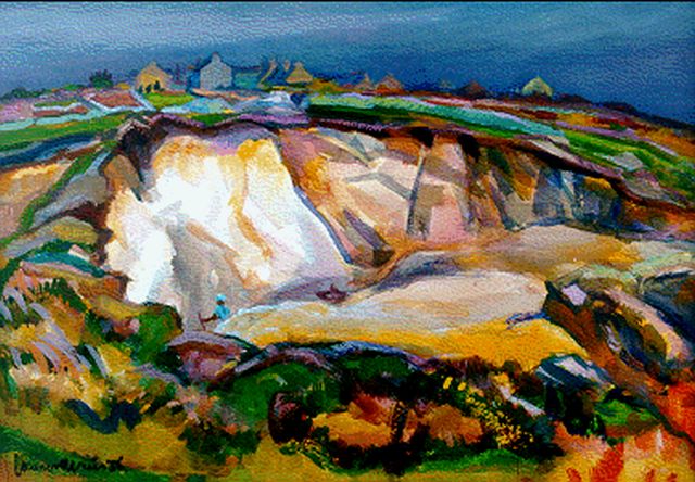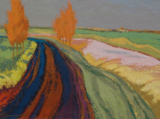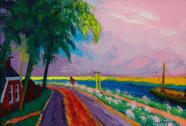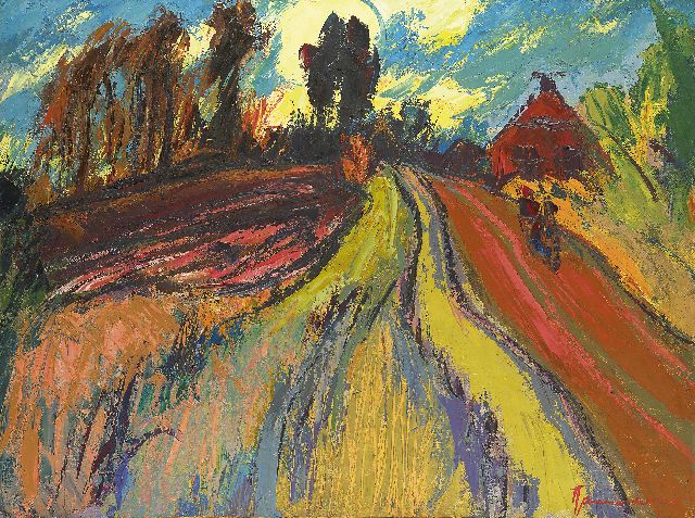 Jannes de Vries, Ploegschilder ‘après la lettre’, putte aanvankelijk zijn inspiratie uit de reizen die hij als jonge kunstenaar ondernam naar Frankrijk, Zwitserland, Italië en Noord-Afrika. Weer terug in Nederland sloot hij zich aan bij de Groninger kunstkring De Ploeg en ontdekte het Groninger landschap, dat met zijn ruimte en licht een van zijn belangrijkste inspiratiebronnen werd. Met zijn schildersezel en -kist achterop zijn fiets gebonden, doorkruiste hij de provincie in weer en wind. Hij zag het schitterende Groninger land zoals het in deze tijd voor een deel ook nog is; zware, zwartblauwe klei, citroengeel koolzaad en diepgoud tarwe, dreigende, donkere wolkenpartijen, romaanse kerkjes en boerderijen in hun karakteristieke kleuren. Het kleurgebruik van De Vries veranderde met de jaren; zijn kleuren werden steeds harder, bijna fluorescerend, en zijn verfstreken wonnen steeds meer aan kracht. Ook zijn techniek werd anders met het verstrijken der jaren; zo gebruikte hij de achterkant van zijn penseel steeds vaker en nam hij regelmatig het paletmes ter hand. Zijn werk krijgt dan een expressionistische kleurstelling die kenmerkend was voor de beginjaren van De Ploeg, maar in schril contrast stond met het werk van zijn Ploegvrienden die inmiddels in een veel gematigder impressionistische toets werkten.