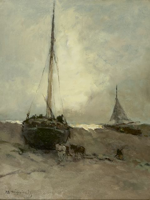 Drooggevallen bomschuiten op het strand van Scheveningen