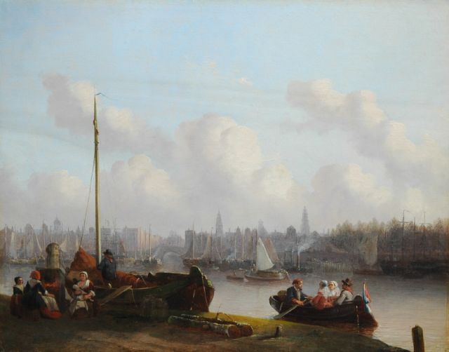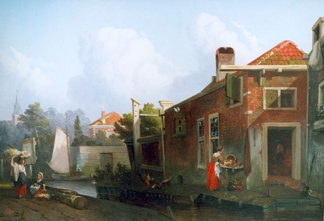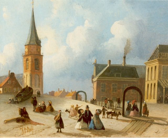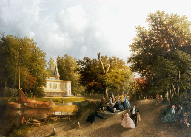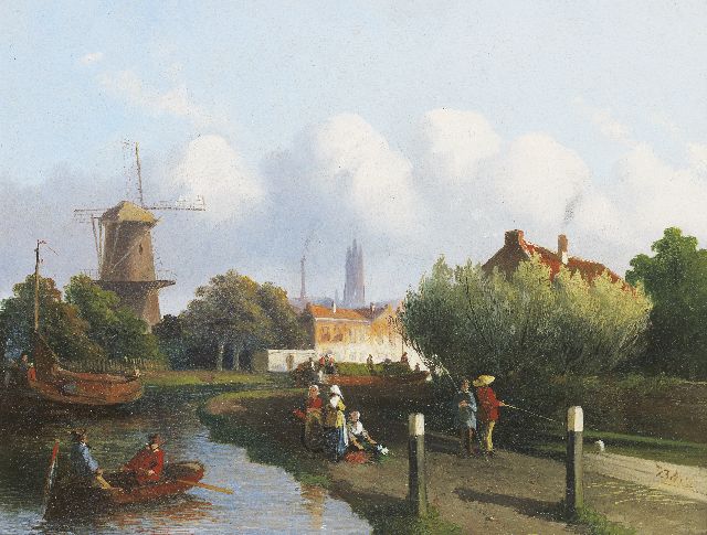 Joseph Bles | Figuren langs de Vliet bij Den Haag, olieverf op paneel, 36,5 x 52,4 cm