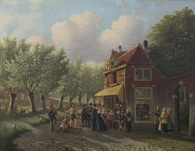 Joseph Bles | Goochelaar voor een dorpsherberg, olieverf op paneel, 20,6 x 26,2 cm, gesigneerd r.o.
