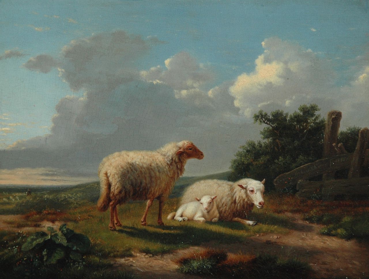Joseph van Dieghem | Landschap met twee schapen en een lam, olieverf op paneel, 18,8 x 24,5 cm, gesigneerd r.m. en gedateerd 1855