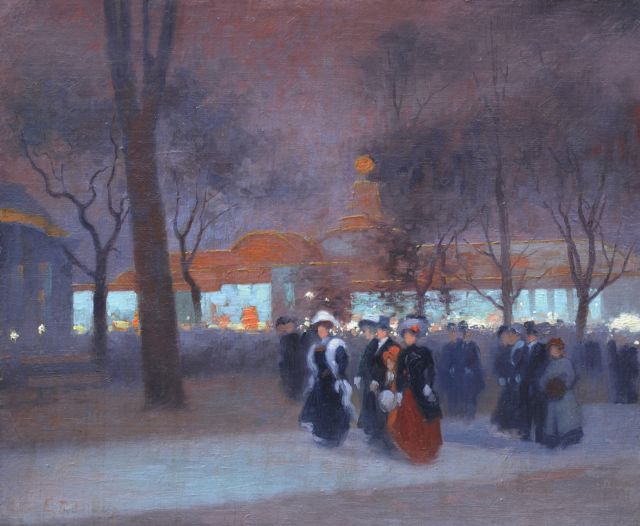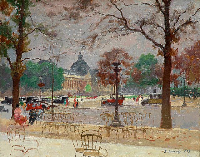 Parijs, dat was het geliefde onderwerp van de Franse schilder Jules Ernest Renoux. De karakteristieke gebouwen, pleinen en straten van de Franse hoofdstad, het dynamische stadsleven met verkeer en wandelaars, maar ook de stille plekken verbeeldde hij op eigen wijze. Renoux hanteerde een levendig palet en penseel. Heldere kleuren, een geraffineerde weergave van het (zon)licht en een bijna vloeiende, impressionistische manier van schilderen kenmerken zijn stijl.