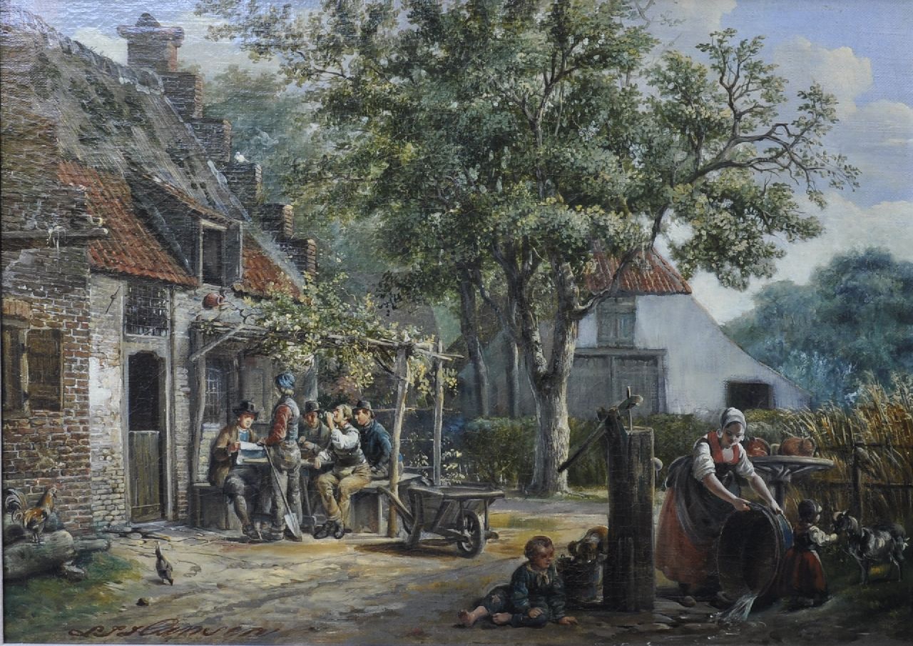 Lambertus Johannes Hansen | Boerendorp met drinkers bij een herberg, olieverf op doek, 41,1 x 56,1 cm, gesigneerd l.o.