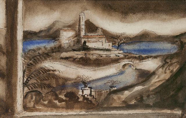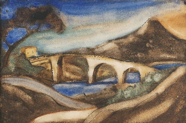 Lodewijk Schelfhout | De brug, inkt, krijt en aquarel op papier, 34,4 x 51,0 cm, gesigneerd r.o. en gedateerd '1920 Corse'