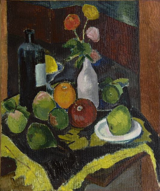 Lodewijk Schelfhout | Stilleven met fruit, bloemen en fles, olieverf op doek, 55,5 x 46,0 cm, gesigneerd r.o. en gedateerd 1908