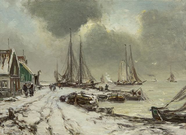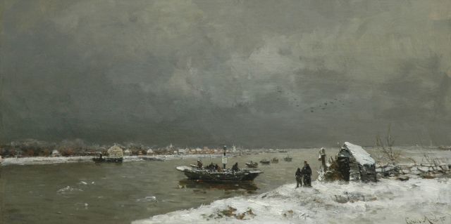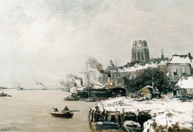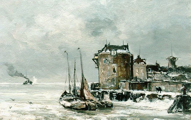 Besneeuwd gezicht op de IJssel met afgemeerde tjalken
