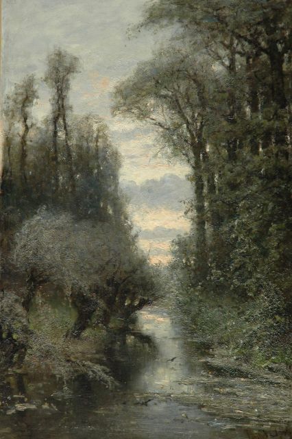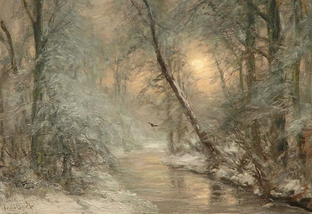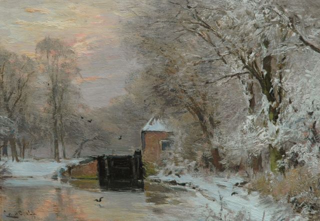 Winters bosgezicht met sluisje, bij ondergaande zon
