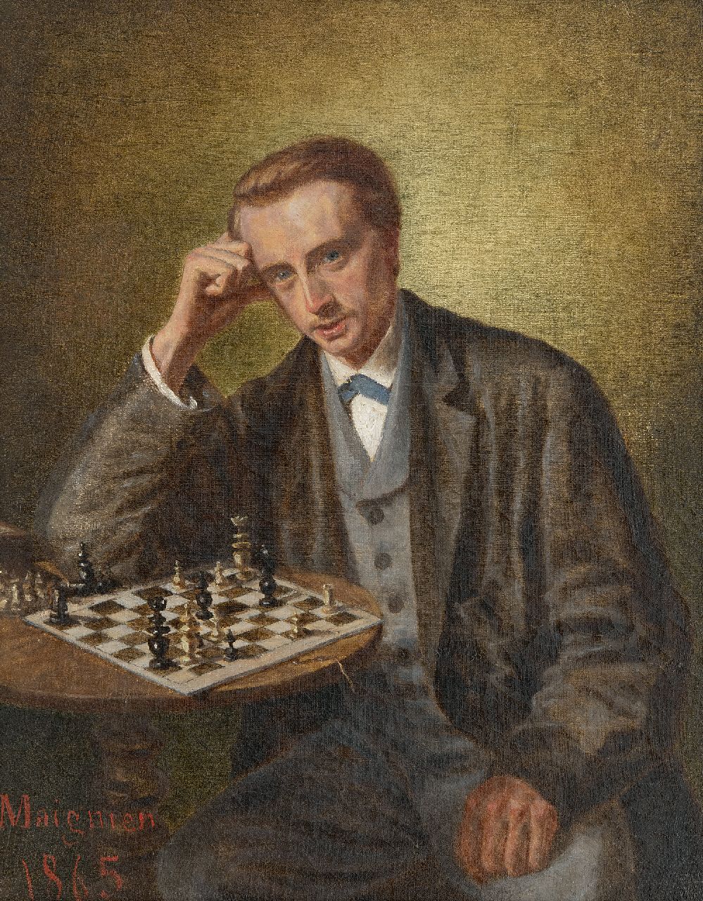 Maignien | De schaker (schaak), olieverf op doek op paneel, 30,5 x 24,2 cm, gesigneerd l.o. en gedateerd 1865