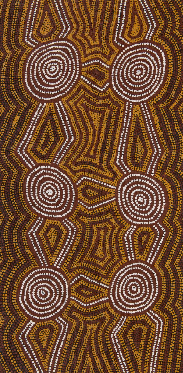 De schilderijen van de Australische Aboriginal kunstenaar Morris Gibson Tjapaltjarri tonen patronen die verbonden zijn met de 'rock hole site' van Warilutjana, ten westen van Lake MacDonnell. Volgens de Aboriginal mythologie trok een groep Tingari mannen naar deze plek, waarbij ze rituelen uitvoerden en bepaalde plaatsen spiritueel inwijdden en vorm gaven. De rondtrekkende mannen werden gevolgd door Tingari vrouwen. Hun tochten en avonturen werden van oudsher mondeling overgeleverd in de zogeheten Tingari Cycle. Morris Gibson Tjapaltjarri groeide op in Pintupi country in de Western Desert. Hij behoort tot de tweede generatie Papunya Tula kunstenaars, die de traditionele stijl van deze traditionele Aboriginal kunst in schilderijen uitbeeldden.