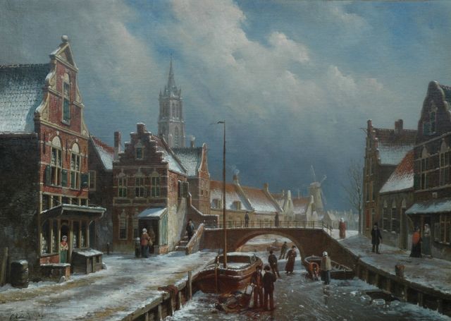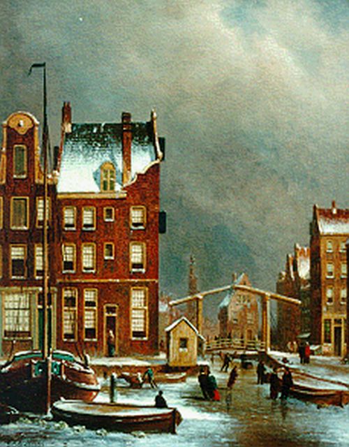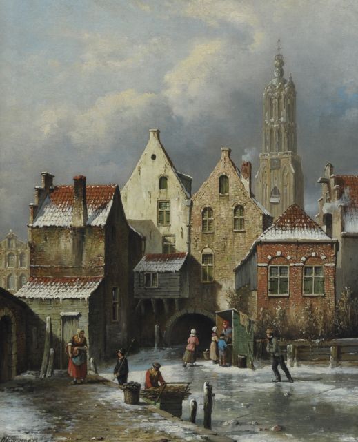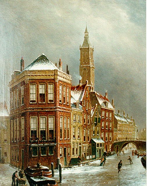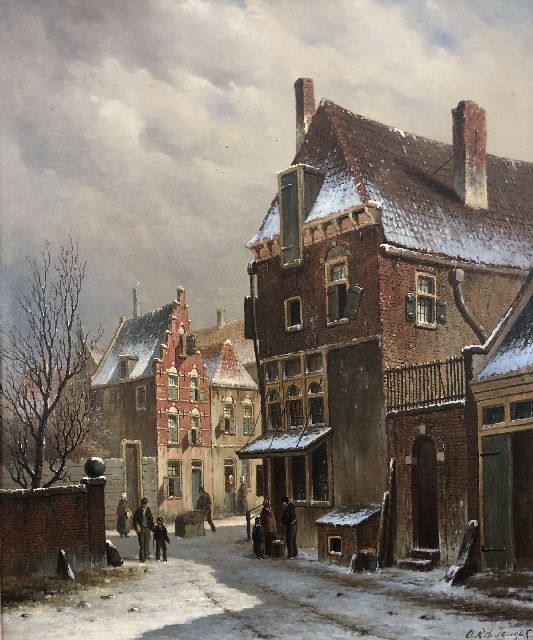 De stadsgezichten van Oene Romkes de Jongh vertonen alle kenmerken van het romantische Hollandse stadsgezicht zoals dat in de 19e eeuw in Amsterdam vorm kreeg: de nauwkeurige uitwerking, de levendige stoffering en de aandacht voor oude, Hollandse architectuur. Van de schilder zelf is niet veel bekend. Hij werd in 1812 in Makkum geboren en woonde en werkte vermoedelijk het grootste deel van zijn leven in Amsterdam. Daar werd hij vooral geïnspireerd door het werk van tijdgenoot Cornelis Springer en diens leerling Adrianus Eversen. Het oeuvre van de schilder omvat sfeervolle stadsgezichten bij zomer en winter, onder andere van Amsterdam en de Zuiderzeehavens, en enkele landschappen.