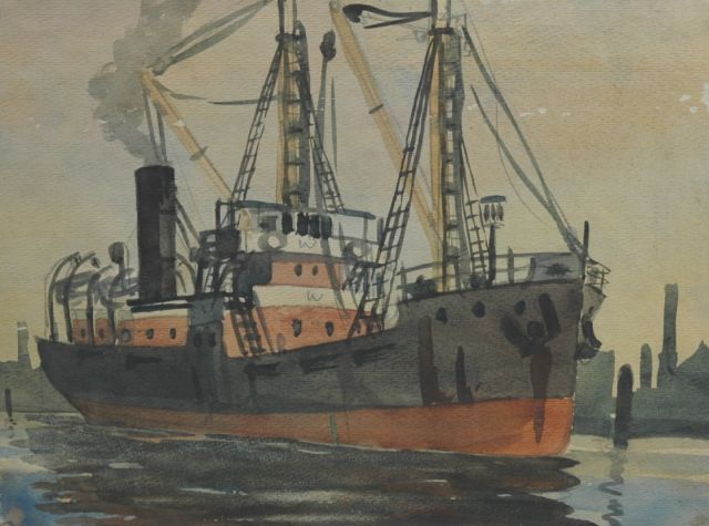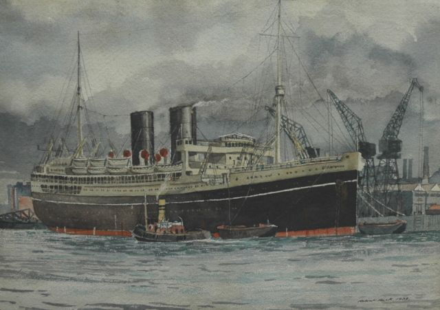 Robert Trenaman Back | Het stoomschip Parapindi aan de kade, aquarel op papier, 25,5 x 35,6 cm, gesigneerd r.o. en verso en gedateerd 1938