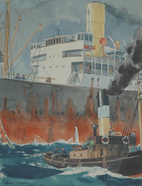 Robert Trenaman Back | De sleepboot neemt het over, aquarel op papier, 29,2 x 49,5 cm, gesigneerd l.o. en gedateerd 1940