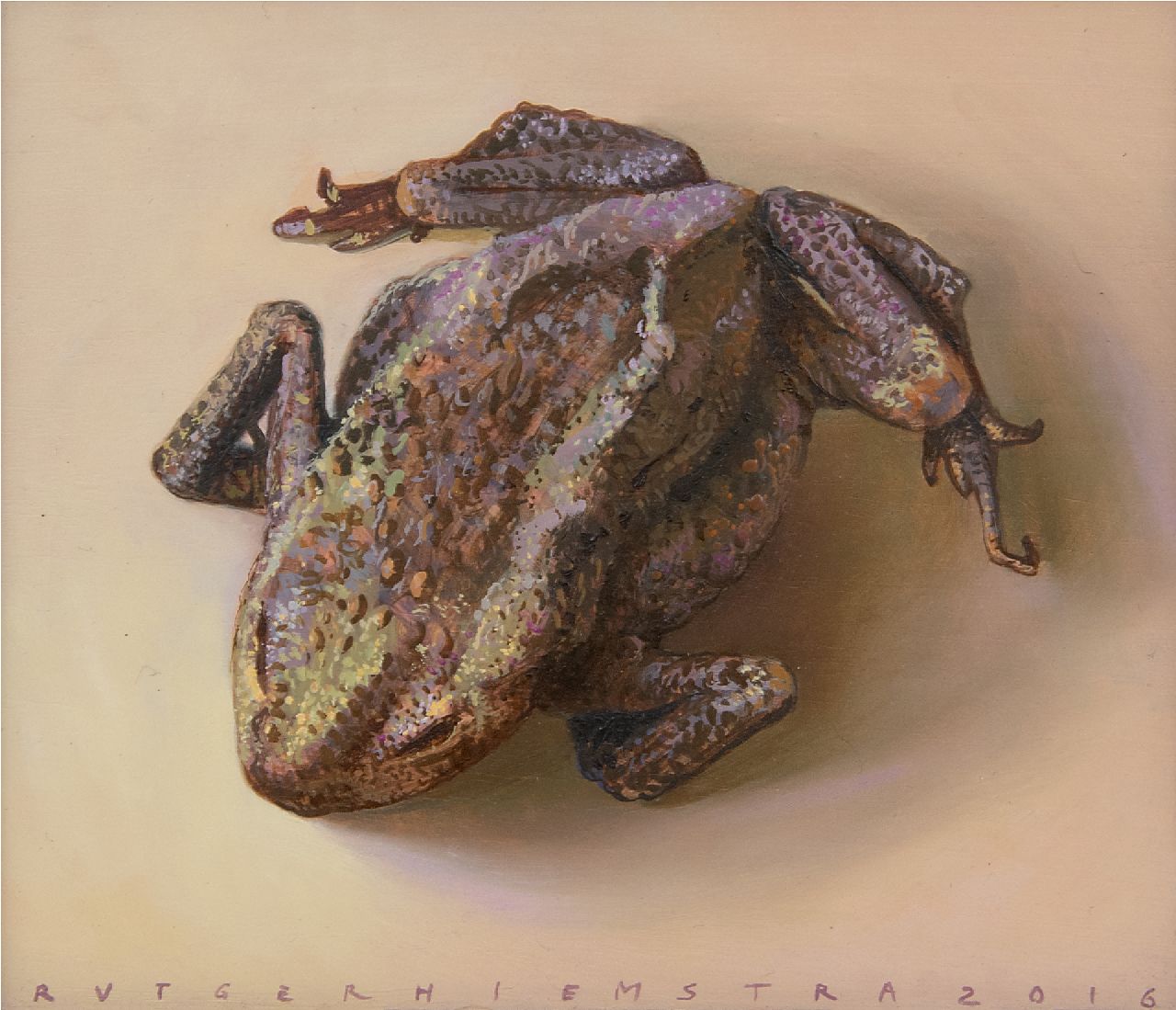 Rutger Hiemstra, geboren in Groningen, studeerde aan de kunstacademie in zijn geboorteplaats en schildert voornamelijk landschappen en stillevens. De Groningse akkers legt Hiemstra met zijn schilderskistje in de buitenlucht vast. In deze en plein air geschilderde landschappen legt hij vaak de nadruk op de wolkenlucht. In zijn stillevens toont Hiemstra zijn aandacht voor de schoonheid van het alledaagse. Groenten, fruit en dieren schildert hij in een realistische stijl waardoor ze niet zelden het effect van een trompe-l’oeil bereiken: een banaan in een broodtrommel, kweeperen in een schaal, paddenstoelen en uien op een tafel of dode vissen en vogeltjes. In zijn atelier verzamelt Hiemstra allerlei spullen om te gebruiken, van schedels en vaasjes tot bloemen en schelpen.