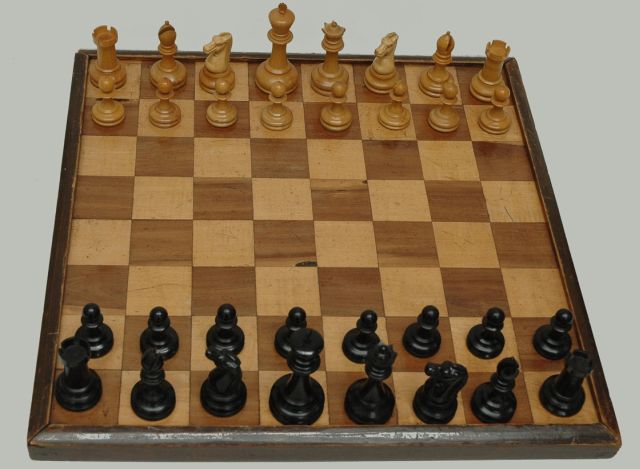 'Staunton Club Size' schaakset met bijbehorende mahoniehouten doos en mahonie- en buxushouten schaakbord op standaard