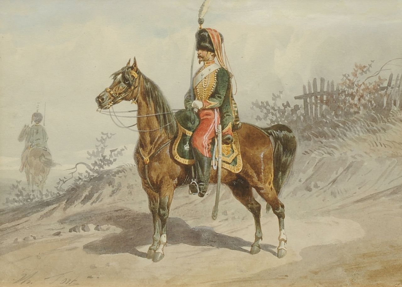 De Fransman Théodore Fort schilderde vooral militaire onderwerpen, een bloeiend genre in de 19e eeuw met zijn vele kleine oorlogen en wapengekletter. Vooral in Frankrijk, Duitsland en Engeland waren er vele liefhebbers. Naast forse, heroïsche doeken van veldslagen en bejubelde militairen waren er ook tal van schilders die de markt voorzagen van werk van kleinere afmetingen. Fort was een van hen. Hij bezat grote kennis van militaire uniformen en blonk uit in het schilderen van paarden, zowel stilstaand als in actie. Daarom is zijn werk ook geliefd bij paardenliefhebbers.