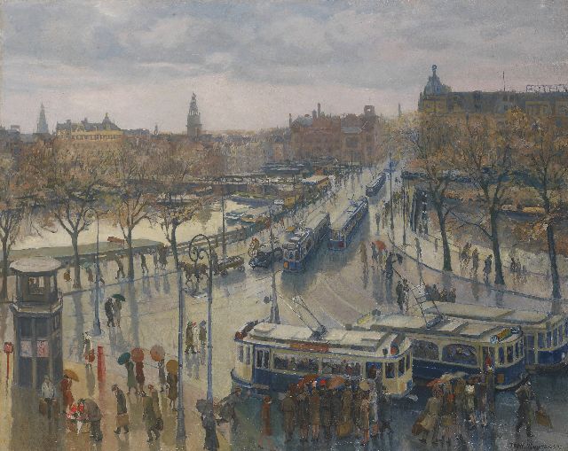 Toon Pluijmers | Stationsplein met het Damrak in Amsterdam, olieverf op doek, 80,5 x 100,0 cm, gesigneerd r.o. en gedateerd '41