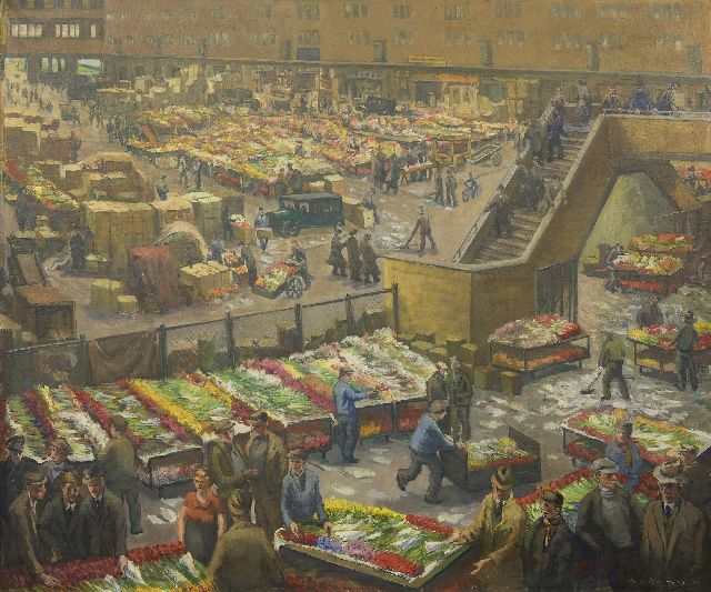 Toon Pluijmers | Tulpenverkoop op de bloemenveiling van Aalsmeer, olieverf op doek, 88,5 x 103,5 cm, gesigneerd r.o. en gedateerd '39