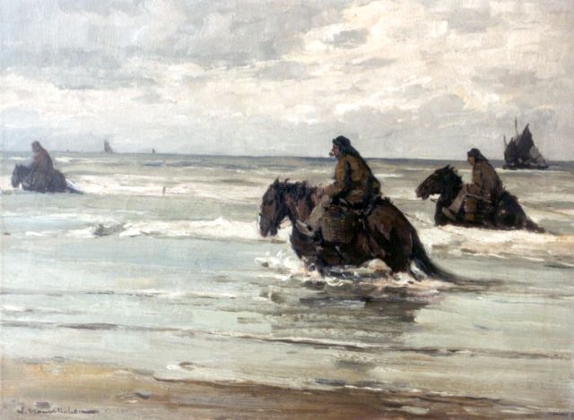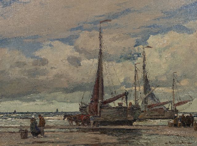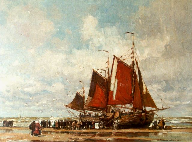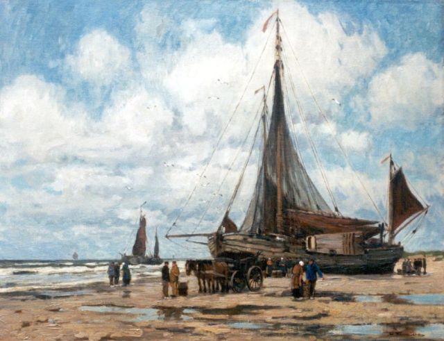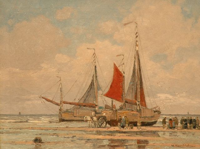 Bomschuiten, de visafslag op het strand en de zee bij Katwijk zijn enkele van de favoriete onderwerpen van schilder Wilhelm Hambüchen. In de voetsporen van tal van andere Duitse kunstenaars maakte hij kort na 1900 zijn eerste reis naar deze populaire Nederlandse badplaats om het pittoreske lokale vissersleven te schilderen. Elke zomer kwam hij terug voor een ongelooflijke periode van 50 jaar. Onvermoeibaar en met brede, behendige penseelstreken schilderde hij de opvallende vissersboten, het vlakke strand onder de hemel met overdrijvende wolken en de levendige groepen mensen die zich verzamelden nadat de boten terugkeerden met de vangst van de dag.